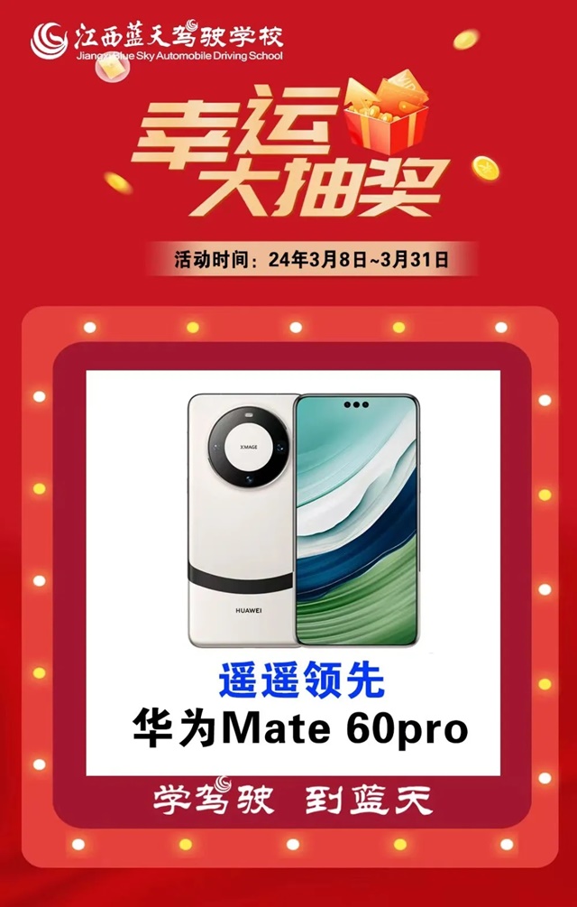 親愛的學(xué)員們,學(xué)車大狂歡來啦!華為 Mate60pro、榮耀手機(jī)、迷你電動車、專業(yè)駕考鞋等超多好禮送不停!4 月 1 號上午10:00 我們駕校服務(wù)大廳,將舉行現(xiàn)場抽獎活動,誠邀學(xué)員作為抽獎嘉賓,到現(xiàn)場一起見證!并且同步在藍(lán)天駕校公眾號全...