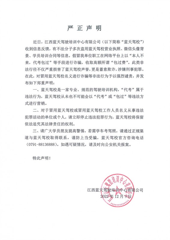 嚴正聲明近日,江西藍天駕駛培訓中心有限公司(以下簡稱“藍天駕校”)收到信息反饋,有不法分子多次盜用藍天駕校營業執照、微信頭像背景、學員培訓合同等信息,假冒我單位職工在網絡平臺上以“本人不來,代考包過”等手段進行詐騙,收取高額所謂“包過費”。...