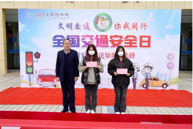 藍天駕校校領導為獲獎學員頒發了現金獎勵,工作人員為參與活動的學員贈送精美隨手禮,校領導與參與活動的學員合影留念。