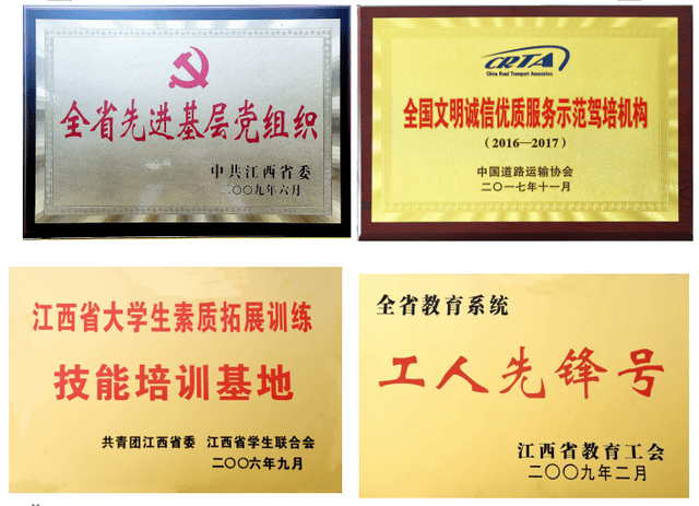 學(xué)校鮮明的服務(wù)特色和突出的社會(huì)效益吸引了社會(huì)各界的廣泛關(guān)注和贊譽(yù),榮譽(yù)接踵而至,先后榮獲了“全國(guó)文明誠(chéng)信優(yōu)質(zhì)服務(wù)示范單位”、“江西省十強(qiáng)駕?!?、“AAA”級(jí)優(yōu)秀駕校、“江西省先進(jìn)基層黨組織”等稱號(hào),被江西省團(tuán)委和江西省學(xué)聯(lián)授予“江西省大學(xué)生素質(zhì)拓展訓(xùn)練技能培訓(xùn)基地”。